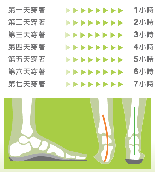 第一次開始穿著矯正鞋墊對於某些人會有以下反應,請不用擔心,耐心參考此說明,您可以很快得到舒緩。 首次穿著矯正鞋墊,第一天穿一小時,若超過一小時後足部有明顯疼痛但非異物感,請將鞋墊拿掉,採用漸進式加時方式穿著,穿到一週後就可正常使用。 倘若仍有持續足部不適情形超過3~5天,請返回醫院/診所請專業醫護人員再檢查。